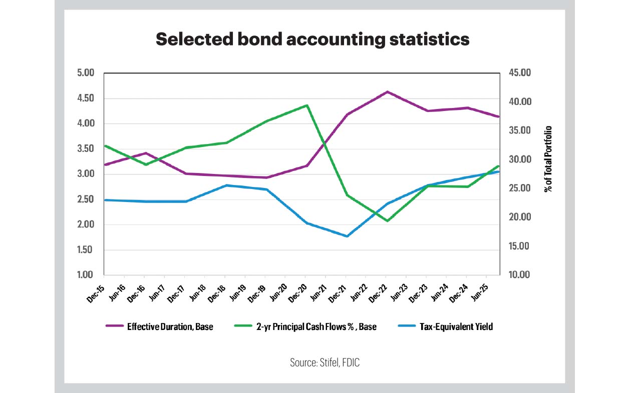 For the past three years or so, a different set of variables has emerged. The most durable (and cringe-inducing) metric is the unrealized loss. As of September 30, the average portfolio had a 7%+ loss. Since we’re finally embarking on a rate-cut cycle, those numbers should improve (shrink), though that’s largely dependent on how the long end of the yield curve reacts. Two positive and notable developments are the continued improvement in yields, which are now over 3% for the first time in at least a decade, and the normalization of the 24-month principal cash flows to the longer-term run rate of around 25% of the total bond portfolio. Effective durations are still longer than most community banks’ preferences but have declined since 2022, reflecting another positive trend.